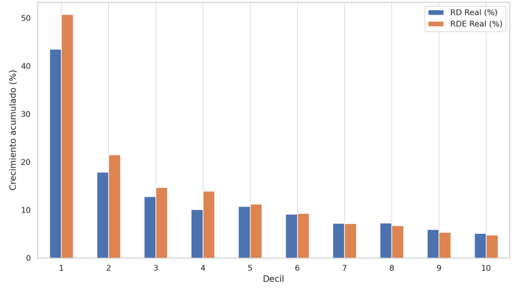 Gráfico 2. Tasa de crecimiento acumulada 2017-2023 de la RD Real y RDE Real por decil