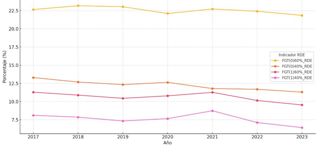 La evolución de los indicadores de desigualdad s80s20 y s90s10 muestra también una tendencia descendente sostenida (tabla 1), lo que confirma un cierre gradual de la brecha entre los extremos de la distribución, especialmente cuando la renta se ajusta por el tamaño y la composición del hogar. En particular, la desigualdad medida mediante la ratio S90/S10 se ha reducido en once puntos a lo largo de los siete años analizados, lo que representa un descenso de gran magnitud y se observa de forma sostenida durante todo el período, con la única excepción de 2020, año en el que el ritmo de disminución fue sensiblemente menor. No obstante, la estructura distributiva continúa mostrando una notable rigidez y la movilidad entre deciles de renta sigue siendo limitada, especialmente en los tramos extremos.
