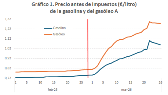 El inicio del conflicto bélico en Irán tuvo una rápida traslación a los precios de gasolinas y gasóleos. En los días inmediatamente posteriores comenzó una escalada de precios que supuso que el precio medio en marzo fuera un 27% superior al de febrero en las gasolinas más utilizadas y un 39% en el gasóleo de automoción despachado en estaciones de servicio.