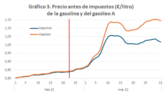El Gráfico 1 muestra la evolución de los precios diarios en esos dos meses a partir de los datos publicados por la D.G. de Política Energética (la línea roja indica el día de comienzo del conflicto).
