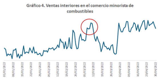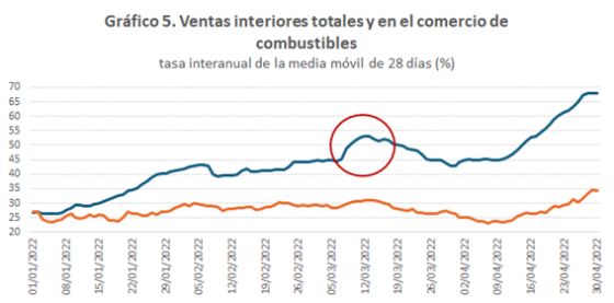 En ambos gráficos están señaladas las fechas en las que se produce un aumento en las semanas posteriores al inicio del conflicto. En el caso de las ventas minoristas de combustibles se observa un repunte en esas semanas y una moderación en las siguientes. No es hasta ya comenzado abril cuando el proceso parece estabilizarse en niveles muy superiores a los de comienzos del año 2022. En las ventas totales el primer impacto se nota muy ligeramente, pero a partir de abril también las ventas en el conjunto de actividades siguen una trayectoria expansiva.