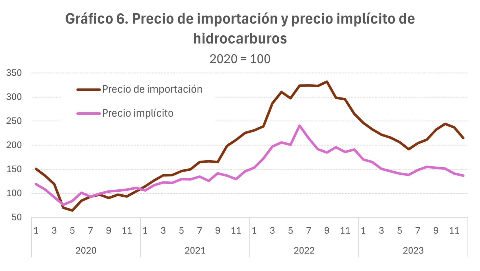 Como se decía, las cifras son siempre en términos nominales. La deflación solo se puede hacer con información externa de precios. Solo en algunos casos se puede hacer una aproximación con información propia y nunca en periodos inferiores al mes. Es el caso de los hidrocarburos para el cual se tiene, por un lado, la información del precio de las importaciones de productos petrolíferos que se puede encontrar en las Estadísticas de Comercio Exterior, y, por otro, se puede construir un indicador del precio implícito de las ventas interiores de hidrocarburos combinando la información de ventas del sector refino que se ofrece en el informe mensual de Ventas, Empleo y Salarios en las Grandes Empresas y los consumos de hidrocarburos que se publican en el fichero trimestral de Series históricas de bases, tipos e impuestos devengados acompañando al Informe Mensual de Recaudación Tributaria. El resultado se muestra en el siguiente gráfico:
