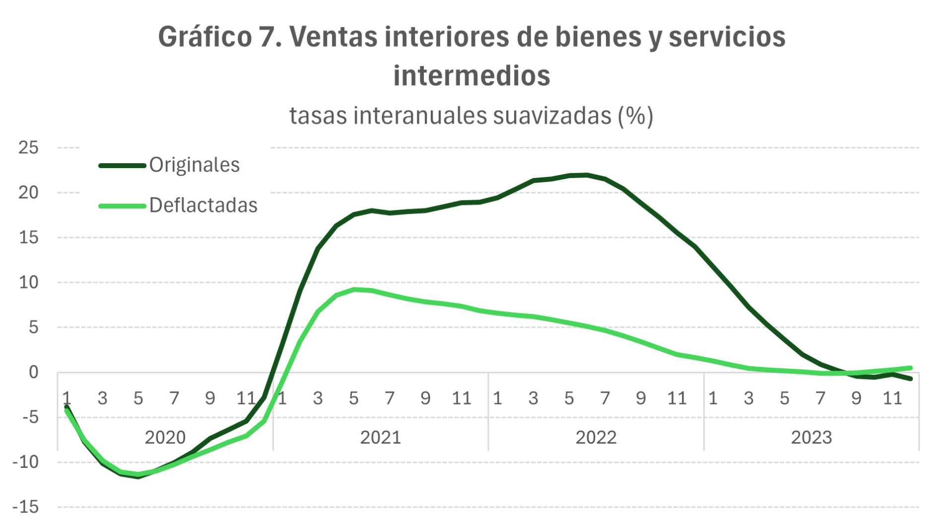 La extensión del efecto de la subida del precio de las gasolinas y gasóleos sobre el conjunto de la economía se puede seguir con el resto de las estadísticas coyunturales y estructurales. En términos mensuales el impacto del aumento de costes que suponen este tipo de incrementos de precios se puede analizar con la evolución de las ventas interiores de bienes y servicios intermedios del informe de Ventas, Empleo y Salarios en las Grandes Empresas. Entre 2020 y 2023 estas ventas se comportaron como figura en el siguiente gráfico: