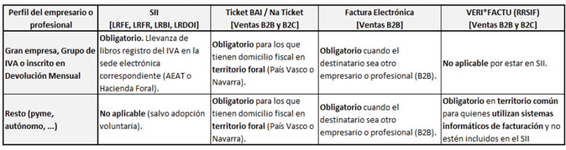 2. El sistema Ticket BAI (Na Ticket, en Navarra), desarrollado por las Haciendas Forales, se está implantando gradualmente desde 2021 y es obligatorio para todos los empresarios y profesionales con domicilio fiscal en los territorios forales, incluyendo autónomos, pymes y grandes empresas. Obliga al envío automático en tiempo real de todas las facturas emitidas, firmadas y encadenadas, con fines de reporte y trazabilidad. Opera de forma concurrente con el SII para los obligados a este último.